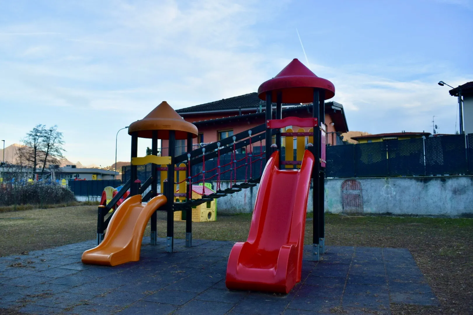 **Giardino Esterno**: Il nostro ampio giardino esterno è il luogo perfetto per attività all’aria aperta, giochi di gruppo e la scoperta della natura. Dotato di attrezzature di gioco sicure e aree verdi, stimola l’avventura e l’apprendimento attraverso il gioco.